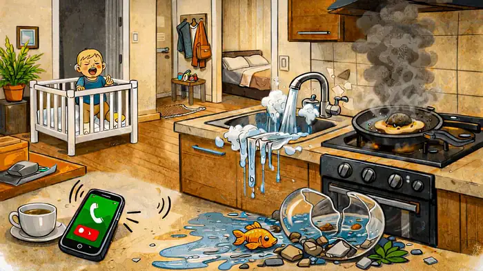 Komplexné riešenie viacerých úloh naraz je znakom vysokej kognitívnej flexibility. V praxi to však často vyzerá tak, že človek behá medzi úlohami a žiadnu nedokončí na 100%. Efektívnejšia stratégia je sekvenčné riešenie podľa priority: 1. Zastaviť eskaláciu (voda), 2. Eliminovať priamu hrozbu (oheň), 3. Zaistiť bezpečnosť osôb (dieťa), 4. Riešiť následky (akvárium, telefón).