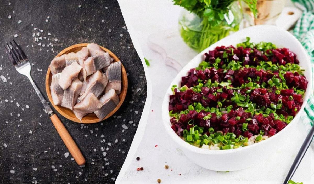 Chcete rýchly, chutný a neobyčajný šalát so sleďom? Zabudnite na dlhé vrstvenie. Nakrájajte uvařenú repu a vajcia na kocky, pridajte filetované kúsky sleďa, konzervovaný hrášok, zelenú cibuľu a premiešajte s majonézou. Výsledok vás prekvapí – je to ako križovatka klasických šalátov, no pripravená za pár minút.