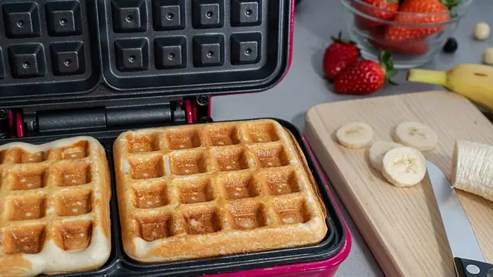 Dôležitým krokom je samotné pečenie. Vaflová žehlička musí byť dobre rozohriata a panel treba jemno namať. Pečte 3-4 minúty, kým vafle nedostanú pekný zlatistý odtieň. Prvá vafľa je vždy „skúšobná“ – pomôže vám doladiť množstvo cesta a čas pečenia.